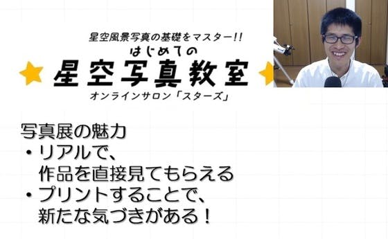 【今夜、はじめての星空写真教室です^^/】4月7日(火)20:00〜20:30※20:30〜21:00はフリートークオンラインサロン「スターズ」メンバー限定☆月に一度の「はじめての星空写真教室」です!今夜のテーマは「写真展をしてみよう!」・プリントに必要な画素数は?・プリント時に気をつけるポイ...