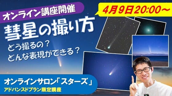 【4月9日、今夜20時〜彗星の撮り方講座を開催します!】オンラインサロン「スターズ」(アドバンスドプラン限定)で今夜20時からオンライン講座を開催します!今回のテーマは「彗星の撮り方」日々、姿や明るさを変えていく彗星。「どう撮ればいいの?」「どんな表現ができるの?」そんな疑問に、やさしく・わか...