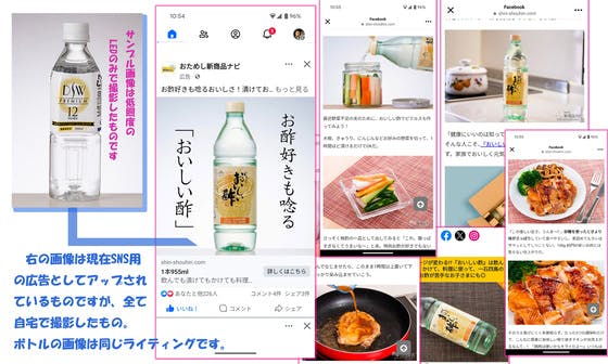 現在Facebookで広告展開されている商品とその使い方を絵にしたものですが、全て自宅で撮影したものです。それほど凝った撮影ではなく、カメラを含む機材も小道具も安価なものを使用しています。画像は著作権を放棄しており、そのものは使用できないのでキャプチャーをここに出しています。水のサンプル画像は...