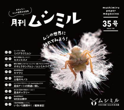 2024年7月(35号)PDFのダウンロードはこちらから → 月刊ムシミル35号(配信終了)目次・写真作品:ミイデラゴミムシ・昆虫図鑑:セスジスズメ・オオヒラタシデムシ/ムシデミー賞/ムシミルクイズ・昆虫発見MAP 土場のキノコ・昆虫アートの間違い探し・昆虫写真ギャラリー・編集後記、他表紙ハゴ...