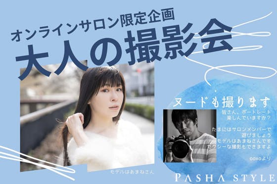 【お申込先 → https://pasha.style/events/185】オンラインサロン限定 大人の撮影会そろそろオンラインサロンメンバーで楽しく遊ぶ場を設けて欲しいという声をうけて、撮影会をセッティングしました。モデルはあまねさんです。なんとヌード撮影も行います。時間はたっぷり3時間。...
