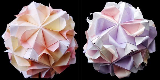 みなさまこんにちは。だんだんと暖かくなってきました。鳥取はもうすぐ黄沙の季節です。車庫の無い車は、毎年砂埃まみれ。たいへんなことになります。たいへん、お待たせいたしました!2023年3月のくす玉おりがみチュートリアルビデオ第一弾が配信されました。三等分ユニット弐のバリエーション「薄色縮緬(うす...