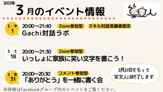 笑文人 3月のイベントスケジュールをです。みなさまこんにちは。笑文人(わもじん)運営事務局です。3月のイベントスケジュールができました。・3月1日(水) 20:00~21:40 Gachi対話ラボ ※参加方法はこちらから・3月18日(土) 20:00~21:30 いっしょに家族に笑い文字を書...