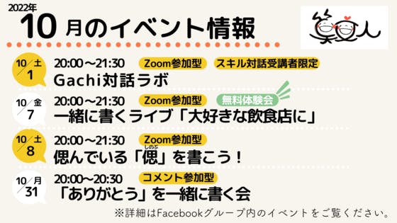 笑文人 10月のイベントスケジュールを公開します!みなさまこんにちは。笑文人(わもじん)運営事務局です。10月のイベントスケジュールができました。オンラインサロン笑文人も10月13日で設立1周年!1年間のありがとうを込めて、いくつかキャンペーンを開催します!・10月1日(土) 20:00~21...