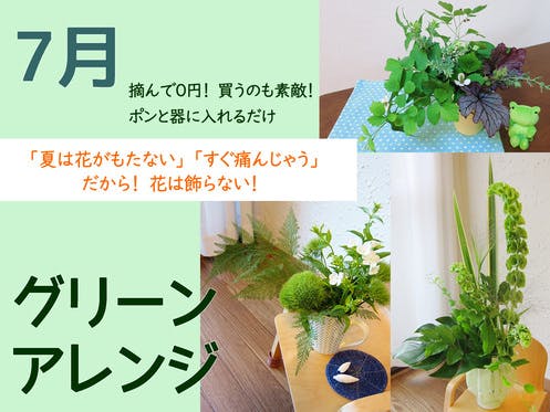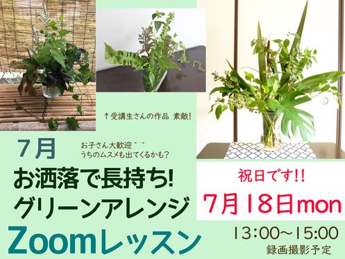 7月のテーマ 夏でも長持ち!お洒落モダンな【グリーンアレンジ】を、実際に叶える♪Zoomレッスン★7月18日 月曜日で祝日! 13:00~15:00 終了しましたーーーーーーーーーー ↑ おそらく、娘が「わたしもやる~!」と出てきます そして庭と駐車場で葉っぱを摘んできて参加します、たぶん ...