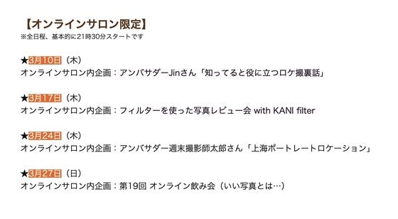 2022年3月の予定は上記の通り。毎回、プロのフォトグラファーによるレビュー会やメンバーチャレンジとしてCDジャケット写真を作ったり、お肌レタッチのオンライン授業など面白いイベントで盛り上がっています。楽しく遊んでいるうちに写真が上手になる。そんなオンラインサロンです。初心者から大歓迎。PAS...
