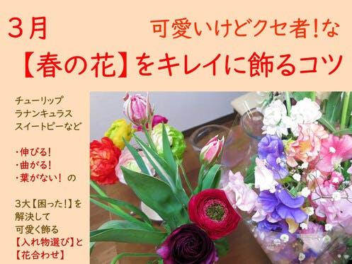 3月のコンテンツ 【可愛いのにクセ物!な ”春の花”をキレイに飾るコツ】<ビデオ6本、計58分> 「葉っぱがなくて寂しい;」「器の中で倒れちゃう;」「くねくね曲がっちゃう!」と可愛いのに 悩ませられちゃうことの多い チューリップやラナンキュラスといったクセのある【春のお花】を、キレイに飾ること...