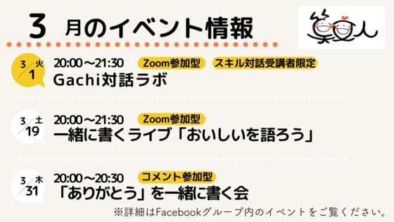 笑文人 3月のイベントスケジュールを公開します!みなさまこんにちは。笑文人(わもじん)運営事務局です。3月のイベントスケジュールができました。・3月1日(火) 20:00~21:30 Gachi対話ラボ ※参加方法はこちらから・3月19日(土) 20:00~21:30 一緒に書くライブ 3月の...