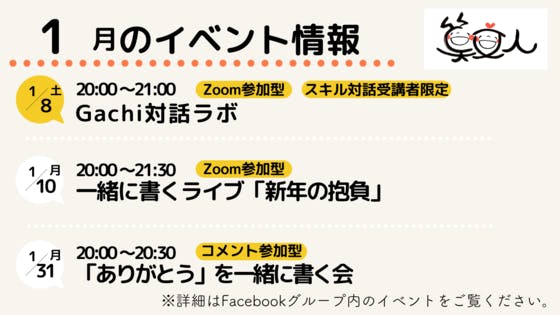 笑文人 1月のイベントスケジュールを公開します!みなさまこんにちは。笑文人(わもじん)運営事務局です。1月のイベントスケジュールができました。・1月8日(土) 20:00~21:00 Gachi対話ラボ ※参加方法はこちらから・1月10日(月) 20:00~21:30 一緒に書くライブ 1月の...