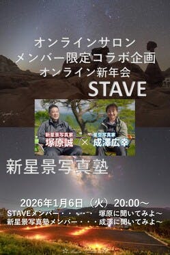 2026年1月6日(火)20:00~星空写真家・タイムラプスクリエイターで星空系YouTuberの成澤広幸さんと、オンラインサロンメンバー限定コラボ企画・オンライン新年会を実施します。こんな機会は滅多にないのでここでしか聞けない話など、直接成澤さんに質問して聞いてみよう。オンラインURLは後日...
