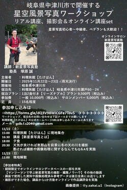 岐阜県中津川市で開催する星空風景写真ワークショップ。旧中山道付近の馬篭宿の池から恵那山とオリオン座、そしてリフレクションを撮影してみませんか?若干の光害はあるものの、十分綺麗な天の川を撮影することができます。梵天郷~馬籠宿の池から望む恵那山と天の川宿泊先の料理旅館【たけはん】で講座をおこない夕...