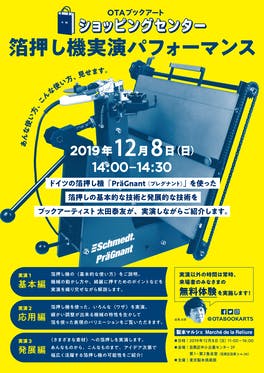 2019年12月8日(日)、東京製本倶楽部が主催する本づくりのフリーマーケットイベント「製本マルシェ Marché de la Reliure」に、OTAブックアート ショッピングセンターが出店します。製本道具の販売の他に、14時から14時30分までの間、実演パフォーマンスを行います。ドイツの...