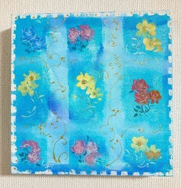 開けるのが楽しみな宝石箱をイメージしてキャンバスに、にじみを多用しガッシュ絵具(水彩)で表現しました。唐草模様は、立体になる絵具を使用しています。オリジナル1点物です。サイズは20㎝×20㎝×厚み3.5㎝価格は税込・送料込みです。壁にピンで止めたりそのまま立てかけることが出来ます。画面左下サイ...