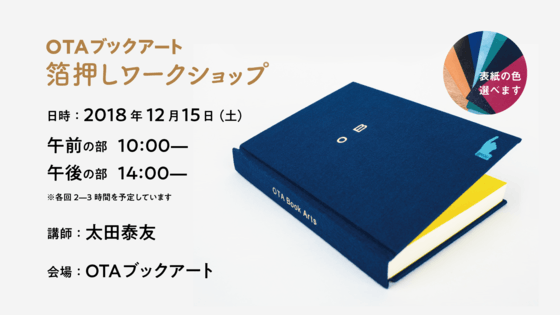 2018年12月15日(土)「OTAブックアート 箔押しワークショップ」活字を組んで「箔押し」の本をオリジナルで作れます!OTAブックアートで、オリジナルの箔押しをして本を作ってみませんか?箔押ししたい文字の活字を組んで、好きな色の表紙に、メタリックやマットの様々な箔を押して、オリジナルの本の...