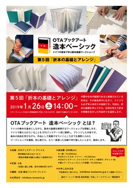 造本ベーシック第5回ワークショップ「折本の基礎とアレンジ」2019年1月26日(土)14:00–ドイツの教本で学ぶ製本基礎ワークショップ「OTAブックアート 造本ベーシック」第5回のテーマは、折本です!中国や日本が起源であると推測されている折本は、その後世界中に広まり、ドイツでも必ず学ぶ本作り...