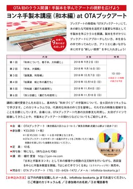 ヨンネ手製本講座(和本編) at OTAブックアート ブックアートの発信地「OTAブックアート」にて、本の新たな可能性を追究する重要な手段として、手製本を学ぶクラスを開講します。経験は問わず、製本を手がかりにブックアートにアプローチしたい方、とにかく本を自らの手で作ってみたい方など、どんなか...