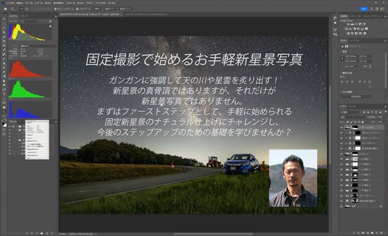 中級者以上向け「マンツーマンで学ぶ新星景写真の撮影、編集ノウハウ」や「Photoshopによる画像処理実演」だけではお伝えしきれない内容を詳しくレクチャー。こんな方を対象としています・固定撮影素材のSequatorでのスタック素材に不満のある方・固定新星景でもクオリティーの高い作品に仕上げたい...