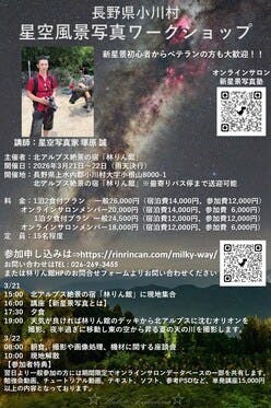 2026年のワークショップは長野県小川村の「北アルプス絶景の宿 林りん館」からスタート。文字通り宿のデッキから北はアルプスが綺麗に望めるので、夕食後には撮影地には移動することなく林りん館から北アルプスに沈むオリオンを撮影できます。撮影中は宿でぬくぬくできるのが良いですね。その後仮眠して朝方に東...