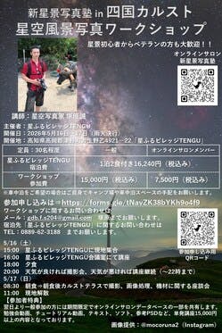 四国の星空の聖地といえば四国カルスト。2026年5月16日~17日に「星ふるビレッジTENGU」を拠点にワークショップを開催します。来年の5月開催ですが、さすが人気の星空撮影の聖地四国カルストですね!定員30名に対して口コミだけですでに20名以上の申し込みをいただいています。残りの枠が少ないた...