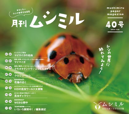 メンバー限定ダウンロード2024年12月(40号)PDFのダウンロードはこちらから → 月刊ムシミル40号(配信終了)目次・写真作品:マイマイガ幼虫・昆虫図鑑:マイマイガ・クモガタテントウ/ムシミルクイズ・昆虫発見MAP/秋の花壇・KIDの昆虫ワールド大冒険「オニヤンマ」・昆虫ギャラリー・編集...
