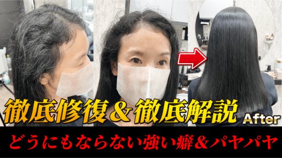50代ということもあり、年代特有のエイジングの癖が出ておりアンダーミドルは疏水毛の強い癖になります。半年おきに全体矯正をされており、毛先にいくにつれて矯正ダメージで硬く髪質が変化しております。癖が強いので選定に関しては強い矯正が必要ですが、ディバイディングラインのダメージと矯正履歴部分のアプロ...
