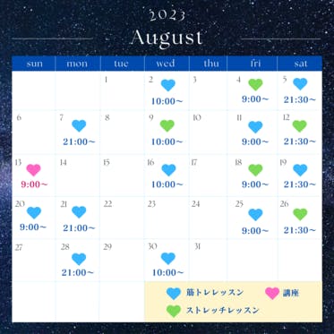 8月予定のスケジュールです!グループトレーニングを中心に開催します★【グループレッスン】8/2(水)10:00〜10:308/4(金) 9:00〜9:308/5(土) 21:30〜22:008/7(月) 21:00〜21:308/9(水) 10:00〜10:308/11(金) 9:00〜9:3...