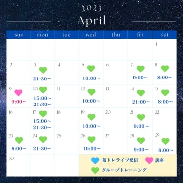 4月予定のスケジュールです!グループトレーニングを中心に開催します★【グループレッスン】4/3(月) 21:30〜22:004/5(水) 10:00〜10:304/7(金) 9:00〜9:304/8(土) 8:00〜8:304/10(月) 15:00〜15:304/10(月) 21:30〜22...