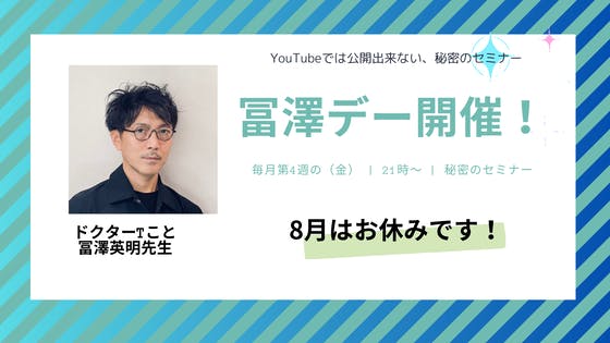 8月の冨澤デーは夏休みとなります。冨澤デーファンの先生方、9月第4週の金曜日を楽しみにお待ちくださいませ。
