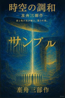 ※ポスター用デジタルアート作品「星舟が降り立つ地」=過去からの来訪「交信の光柱」=いまを貫く覚醒「帰還の門」=未来への還流星舟が降り立つ瞬間から、光柱を通して交わる意識、そして帰還の門へと至る旅。青と金の光が語るのは、人と星、人と魂の再会の物語。― ノアルラミア