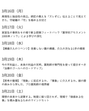 3月16日〜3月21日にオンラインサロンで発信した記事の内容のタイトルをまとめました。オンラインサロン「薬屋たいぞーの薬学で患者を語る実践力養成塾」では、僕が現場で実践したり、経験したりしたリアルな1次情報を毎日1000文字程度の記事にして共有をしています。気になる方はぜひオンラインサロンに加...