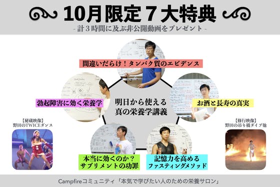 10月入会者限定は、初月無料に加えて、非公開動画7本の特典がつきます!非公開動画は、身近な話題でありつつも深い理解を必要とする、「トレーナーが知らないタンパク質のエビデンス」「お酒と長寿の真実」「記憶力を高めるファスティングメソッド」「勃起障害(ED)に効く栄養学」「本当に効くのか?サプリメン...