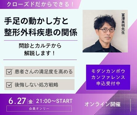 今月の会員限定冨澤デーは「手足の動かし方と整形外科疾患の関係」です。冨澤先生の臨床に役立つセミナーは会員限定特別版です。