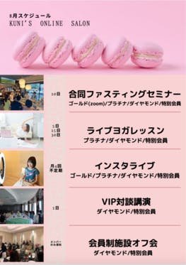 8月のkuni's Online Salonのスケジュールが出ました!1日はVIP対談です。合同ファスティングは10日12:00〜14:00を予定しております。オフ会は会員施設ベイコートを予定しております。開運ツアーは別途ご案内します。詳細は改めてPOPにてご案内させて頂きます。