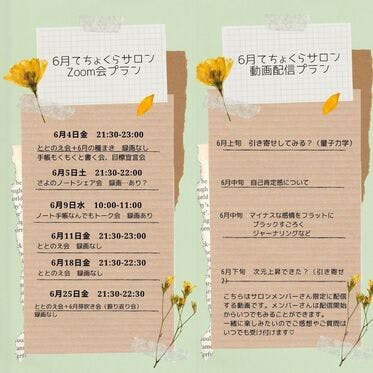 6月のサロンのzoom会と動画配信の予定です!!ととのえ会以外のzoom会は録画予定です。録画した動画は一週間ご覧いただけます。動画配信の動画はサロンにいらっしゃる限りはずっとご覧いただくことができます。