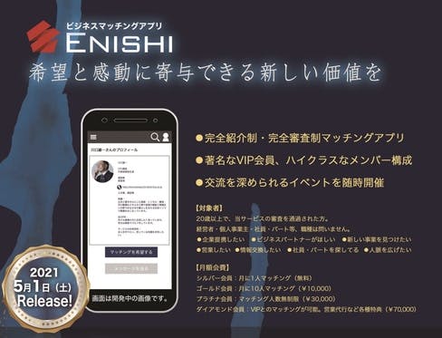 kuni's Online Salonは完全紹介制・審査制ビジネスマッチングEnishiをスポンサーに迎え、サロン会員在籍中(ダイヤモンドプラン)エニシマッチングアプリをゴールド会員(通常月額¥10,000)を無料で利用可能とさせていただくことになりました。月に1回〜2回VIP会員による講演や...