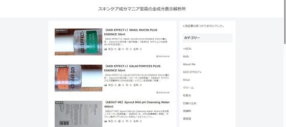 進捗報告です。添付画像の様に、シンプルですがサイトを立ち上げました。楽天ブログで掲載していた全成分表示の再掲載を現在は行っています。以前の様に成分の効果を色分けするかは検討中です。ご要望があれば、美容成分をメインに色を入れようと思います。宜しくお願いします。