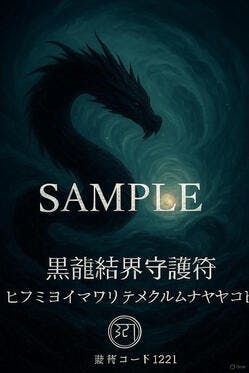 ポスター用PNG形式黒龍結界守護符(護符コード1221)黒龍の波動を宿し、持つ者の内と外の結界を同時に護る護符。日常の祓い・瞑想・旅の守護にも適します。✦ デザイン内容ベース:黒龍守護波動役割:防御・結界・浄化・反転返し文字: タイトル → 黒龍結界守護符 コード → カタカムナ第七首 「ヒフ...