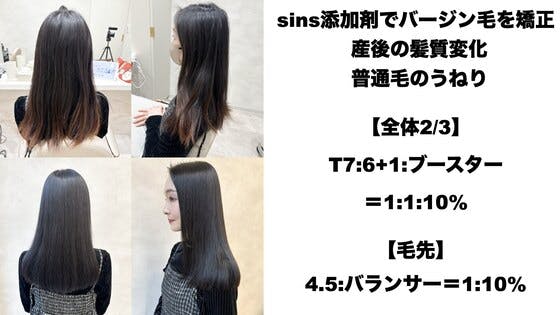 ・30代半ばのお客様・4年前の出産を機にホルモンバランスが乱れ、根元よりも中間〜毛先に癖が出ております。・髪質は普通毛 ・癖は毛先にかけてS字にうねる癖・矯正履歴なし ・カラーは最後3年前 毛先以外はバージン毛というケースにsins添加剤を使用して髪質改善を行いながらの矯正