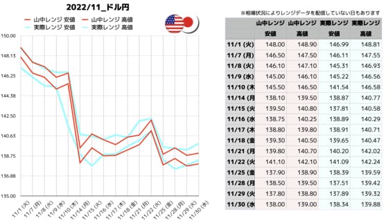 こんにちは。サロン事務局です!バンク・オブ・アメリカで活躍していた山中康司のレポートは、名だたる金融機関やヘッジファンドでも閲覧されております。今回は今年の7月〜11月までのレンジデータを集計・可視化しました。今まで山中のモーニングレポートをチェックしていなかった人も、今後参考にしてみてはいか...