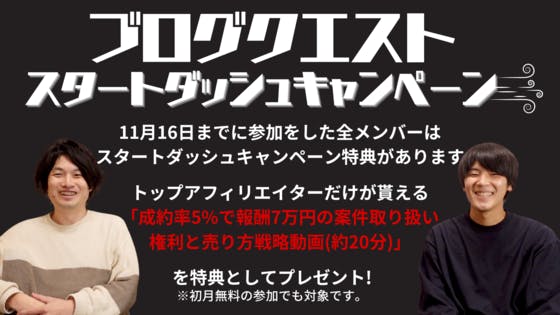 こんにちは、てつです。つい先ほど、CAMPFIREcommunityにて毎月の広告収入と数千万円売却を狙うレベルアップコミュニティ「ブログクエスト」の募集が開始されました。ご参加いただいているメンバーの方はブログクエストでブログ運営を楽しみながら継続していきましょう。ブログクエストにご参加いた...