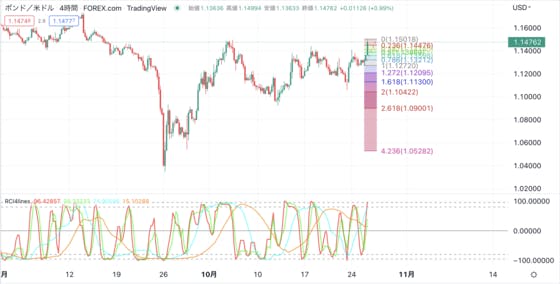 ポンドドル4時間足がアセンディングトライアングル形状となりつつあり、上昇機運が高まってきているように感じます。英国の新スナク首相は、インド系イギリス人であり、元ゴールドマンサックスなど、経歴が素晴らしい人物でした。本日のブルームバーグの報道でも、組閣人事は、自分の支持者だけでなく、あらゆる人事...