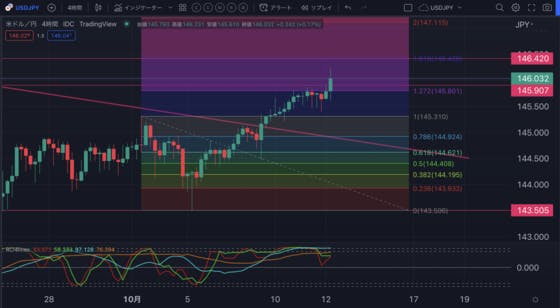 本日はタイムエクステンションの変化日です。今朝ほど、ドル円は146円に乗せてきており、24年ぶりの高値を更新中です。2015-2016年ごろのドル円高値の攻防戦を見ていると、このような短い押し目に対して、フィボナッチエクステンションで1.272や1.618がよく効いてみました。日柄が良いことと...