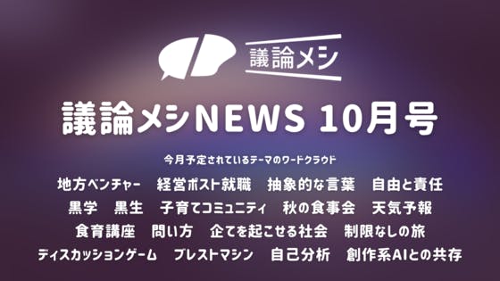 どうも、議論メシ主宰の黒田悠介です!食欲の秋ということで体重が順調に増えていますが、スポーツの秋でもあるのでウォーキングの時間を増やしてなんとか対抗しようとしています。今のところ食欲の秋が圧倒的な力を見せつけていますが、年内でなんとか体重の帳尻を合わせたいと思っています。さて、この「議論メシN...