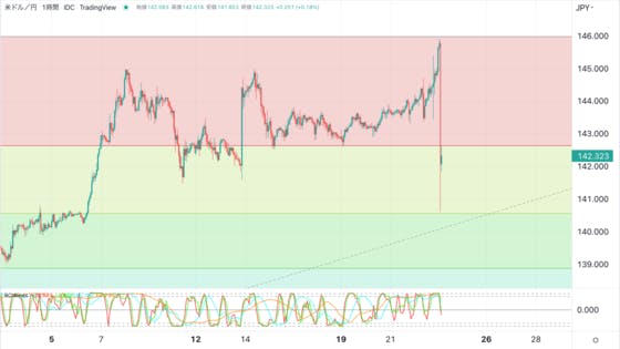 捕まりかけているので、一度、ノーポジションとししたいと思います。後ほど、過去の円高介入のレポートを提示しますが、値動きが細かく激しいので、レートだけ先に配信といたします。【現在の保有ポジション】ドル円142.33買い レバ0.25倍 ストップ139.30円 リミットフリー →142.20でクロ...