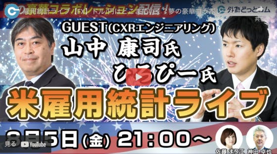 こんにちは。今晩の雇用統計ライブは、外為どっとコムのYouTubeチャンネルに、特別ゲストとして出演してきます!ぜひお見逃しなく♪「雇用統計ライブ【FX】ドル/円はどこまでいく?夢の豪華コラボレーション配信!」https://www.youtube.com/watch?v=DmZj1inzPfM