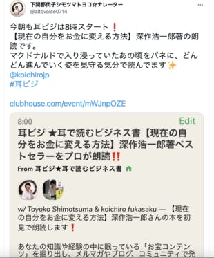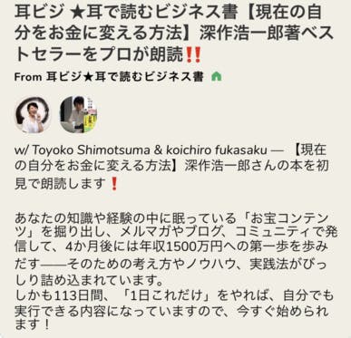 こんにちは、深作浩一郎です。人気ナレーターの下間都代子さん(シモツマトヨコさん)が、毎朝8時から開催している話題のビジネス書を朗読する人気ルーム【耳で読むビジネス書「耳ビジ」】に今日も出演しました。5日連続の3日目、折返し地点になります。今日も休み明けの水曜日、てっきち中だるみするのかな、と思...