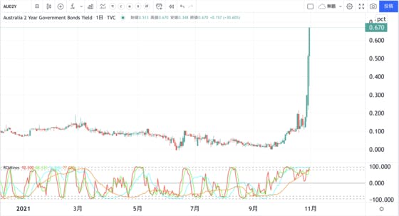 オーストラリアの短期金利が急騰をはじめております。こちら2年債利回りですが、つい先日まで0.1%だったものが、0.67%と急騰です。今週、ロイターからこのような記事が出ていたのですが、その後、急騰となりました。https://www.reuters.com/article/australia-...