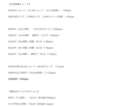 10月のトレードはクロス円中心に、スパンの長いスイングトレードで取ることができました。月初に持ち越したロンドンフィキシングトレードポジションや大きな上昇相場からくるちょっとした調整下落も器用に取れましたし、いろいろなパターンでトレードを披露出来たと思います。未確定分の含み益でも+512pips...