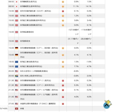 今週の経済指標の各国のインフレ指標が発表される目白押しです。【11日月曜】15:00〜 ノルウェーCPI発表 前回+3.4% 予想+3.9%【12日火曜】15:00〜 英・9月失業率 前回+4.6% 予想+4.5%【13日水曜】15:00〜 英・GDP 前回+0.1% 予想+0.4% (前...