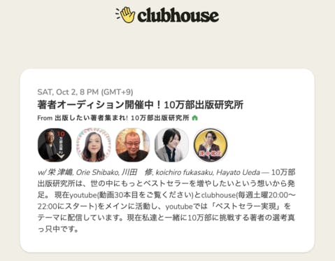 深作浩一郎です。今日10月2日、20時から〜クラブハウス初挑戦します。出版社および関係者に「番組に出てください」って誘われたのでたまには喋るか、と思って喋ります。今晩20時から10万部出版研究所、というルームらしいです。https://www.clubhouse.com/event/MOpze...